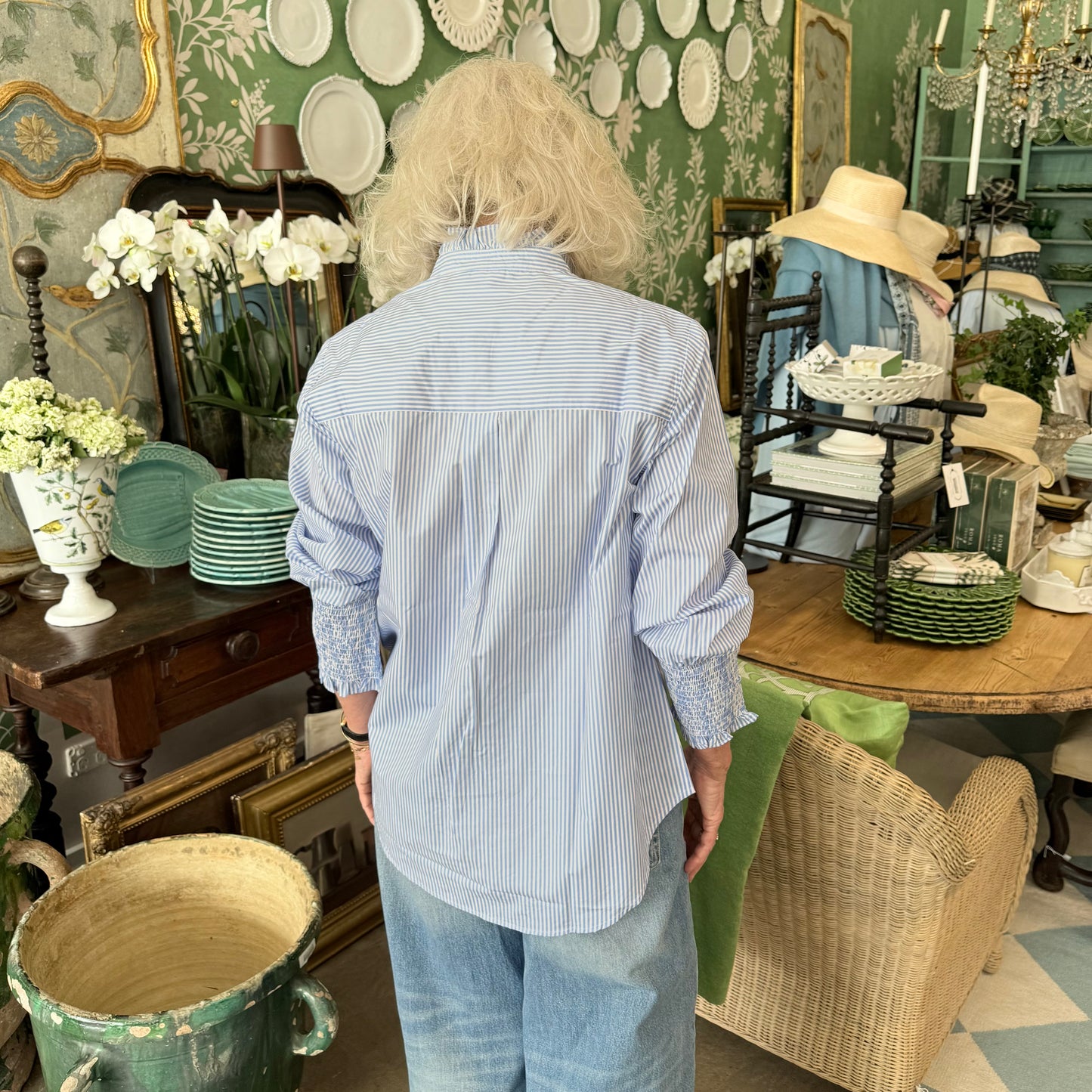 A lovely pale blue and white stripe shirt in 100% pure cotton. With a gorgeous ruffled button-up front and collar detail and unique sheering cuffs and scooped back.