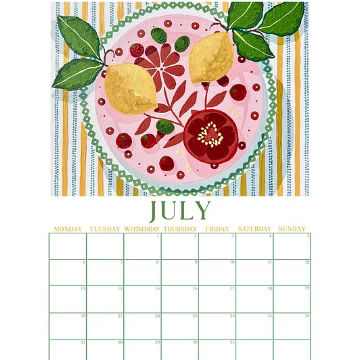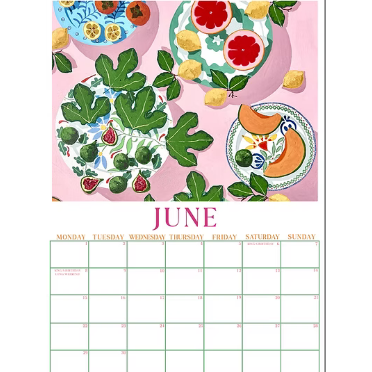 This colourful calendar was hand designed by Emma Sheehan, featuring twelve of her original artworks. This wall calendar is sure to bring some colour and joy to your home. The A3 calendar is printed here in Australia on 240gsm card in matt finish and designed to hang vertically on black wiro binder as shown.